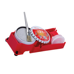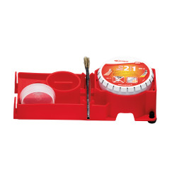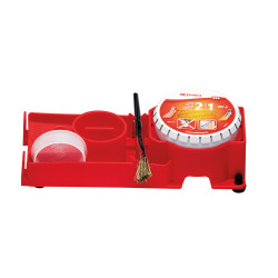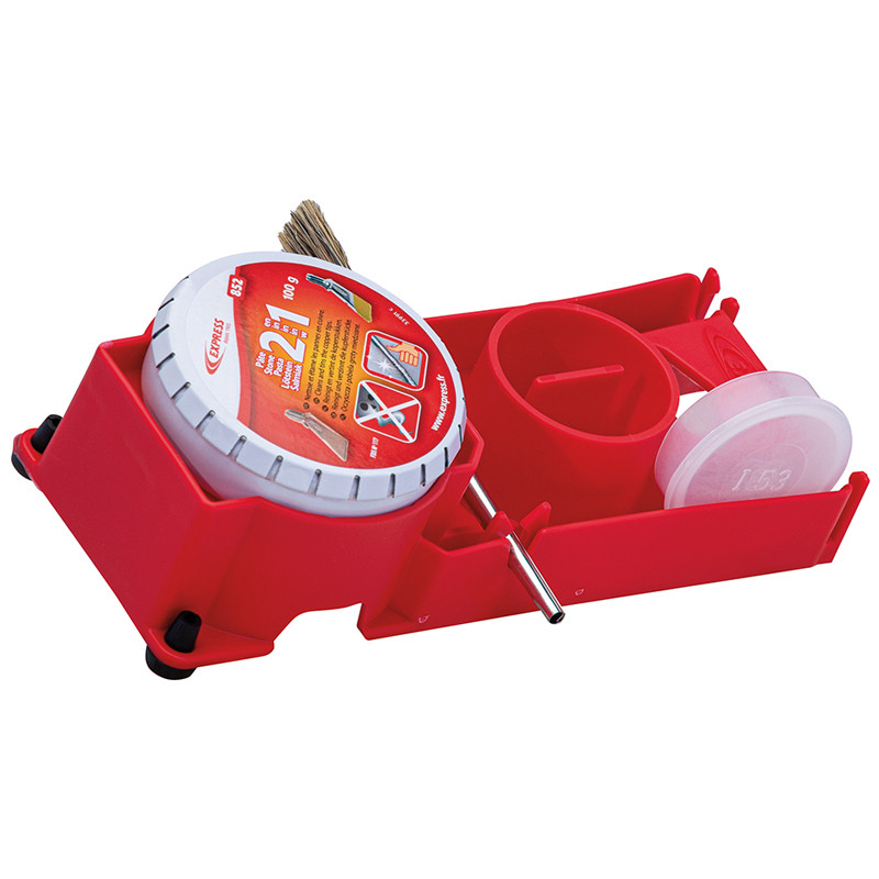 Neue Platte basierend auf Praxiserfahrung. Auf Grundlage dieser Tests entschied sich Guilbert Express, eine neue Platte für das Dachdecker-Eisen zu entwickeln. Sie wurde so konzipiert, dass ein Topf der Lötpaste Art.-Nr. 852 aufgenommen werden kann und gleichzeitig folgende Eigenschaften bietet: einen dedizierten Platz für den Fluss-Pinsel, einen Behälter für den Décap’Inox Fluss Art.-Nr. 857, speziell entwickelt für verzinkten Edelstahl wie Uginox Patina oder Uginox Top, eine praktische Tropf-Stopp-Lasche zum Abwischen des Pinsels sowie vier rutschfeste Füße für maximale Stabilität, unerlässlich bei Arbeiten in der Höhe oder im Freien. Ein Applikationspinsel ist ebenfalls enthalten, um den Fluss einfach auf die zu verbindenden Metallteile aufzutragen.